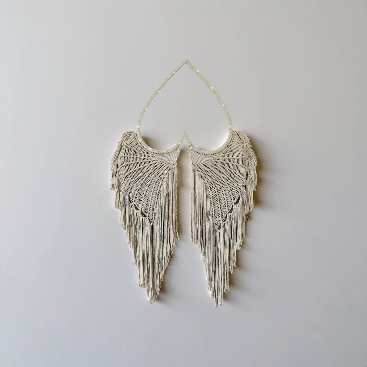 Alas tejidas en fibras de algodón color crudo en técnica macramé sobre corazón en madera
