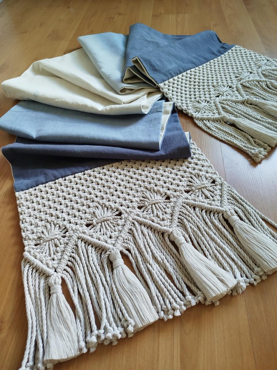 Camino de mesa doble faz elaborado en lona de algodón con un lado en color crudo y otro lado teñido completamente de forma manual en tono a elección del cliente, sus extremos son tejidos con fibras de algodón crudas en técnica macramé.