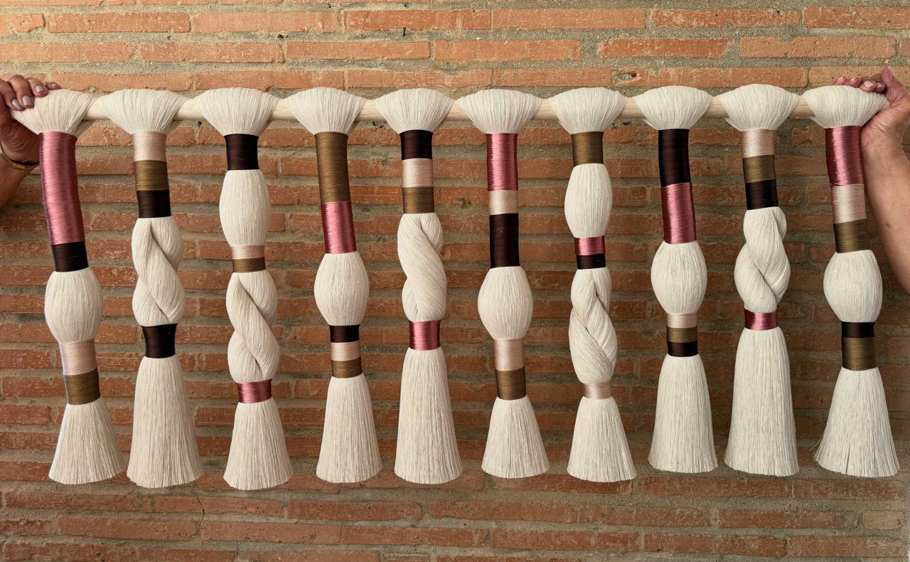 Tapiz embarrilado tejido con fibras de algodón crudo peinado y fibras de diversos tonos a elección del cliente sobre un madero natural recto pulido.